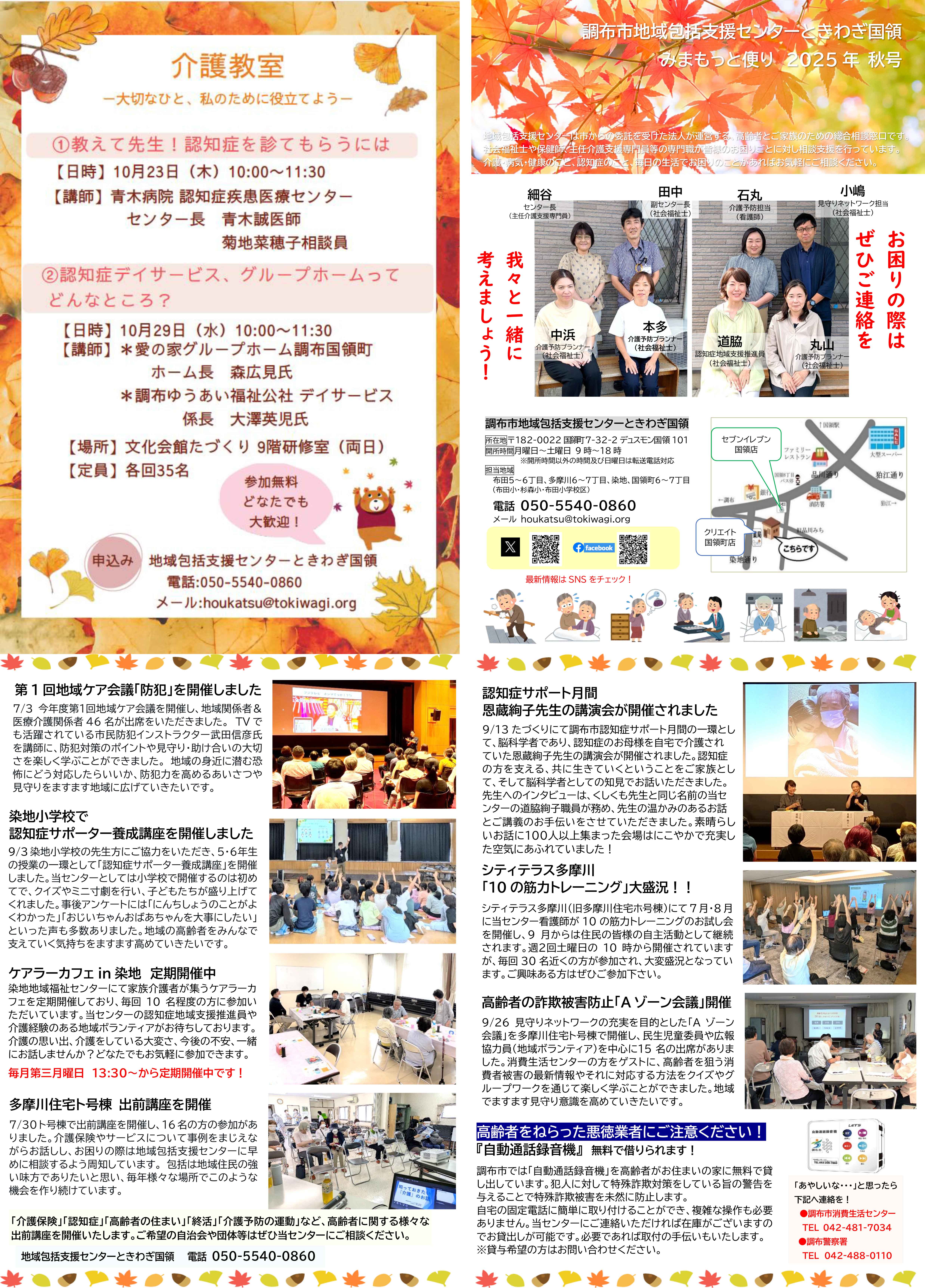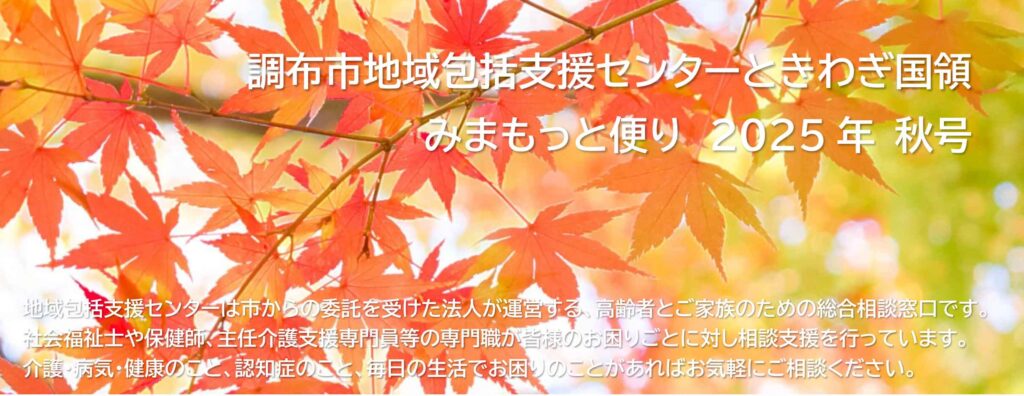 2025年10月10日 / 最終更新日 : 2025年10月17日 happyusako ▼▼その他 みまもっと便り2025年秋号【地域包括支援センター ときわぎ国領】 地域包括支援センター「ときわぎ国領」の広報誌 2025秋号です。秋冬の開催イベントのご案内など情報満載、どうぞご一読ください。詳細はこちらをご参照ください ⇨ みまもっと便り2025秋号