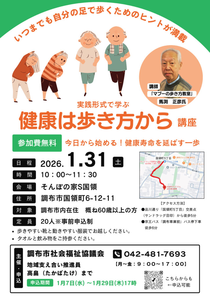 「健康は歩き方から講座」【1月31日(土)10時~11時半 そんぽの家S国領】