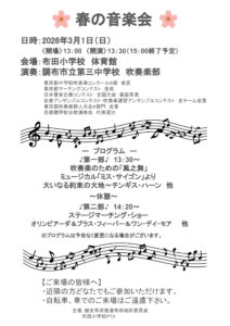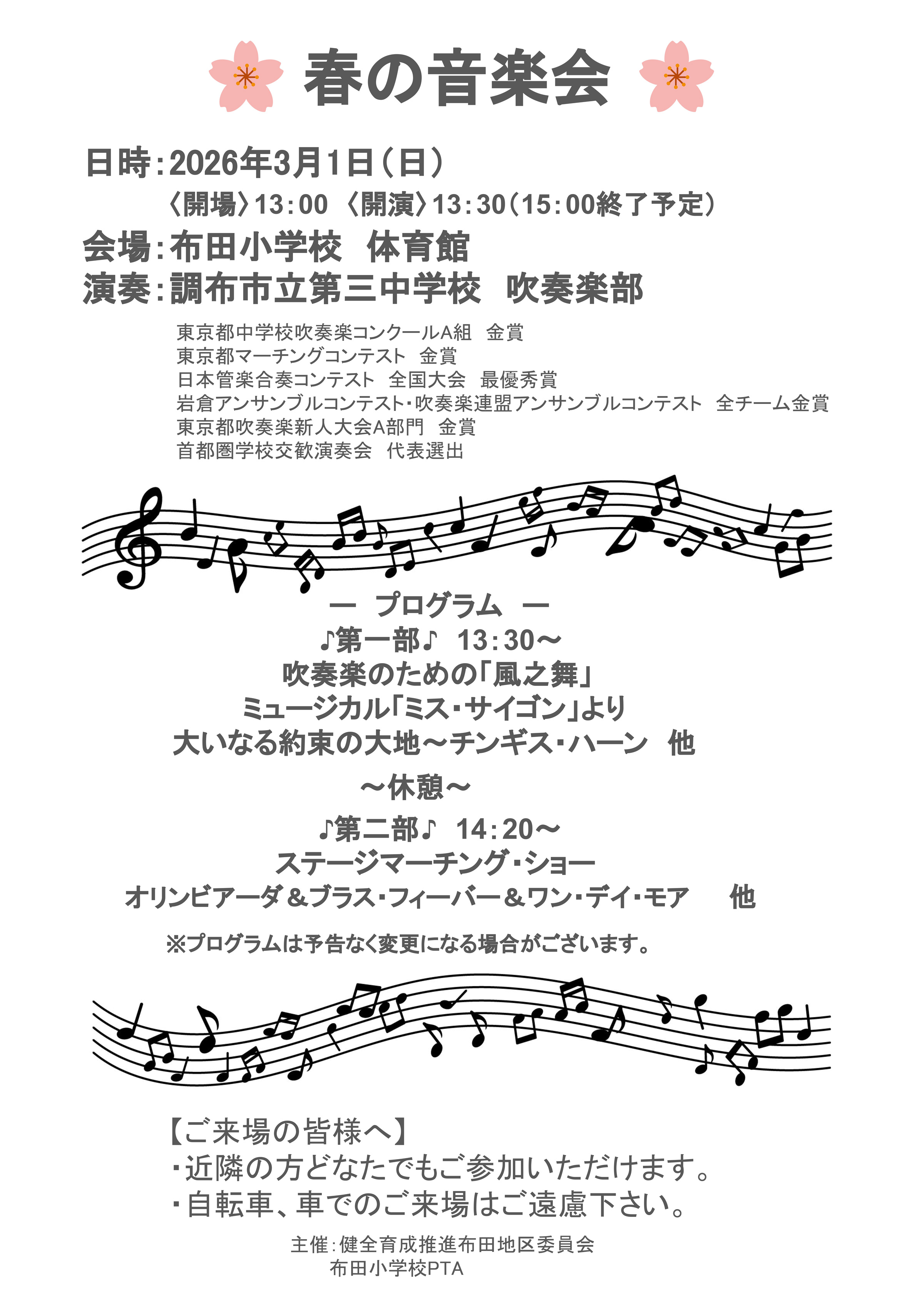 調布第三中学校吹奏楽部 春の音楽会【3月1日(日)13時半~15時(開場13時)布田小体育館】